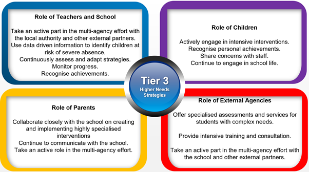 Tier 3 - Higher Needs Strategies Support: Furnishing specialised support for children, young people, and families with complex attendance requirements, including access to external agency support when necessary.